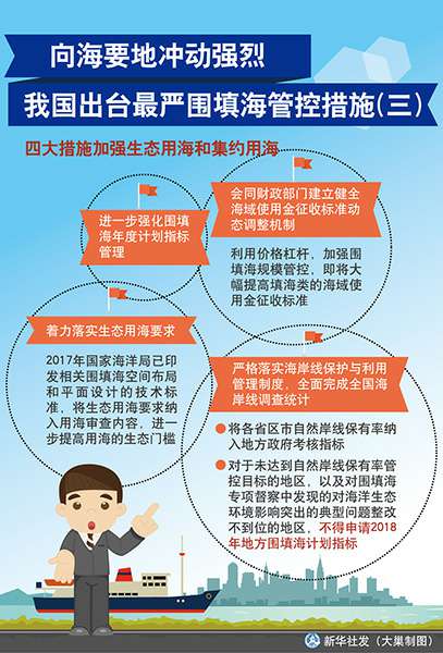 ——着力落实生态用海要求,2017年国家海洋局已印发相关围填海空间布局和平面设计的技术标准,将生态用海要求纳入用海审查内容,进一步提高用海的生态门槛。