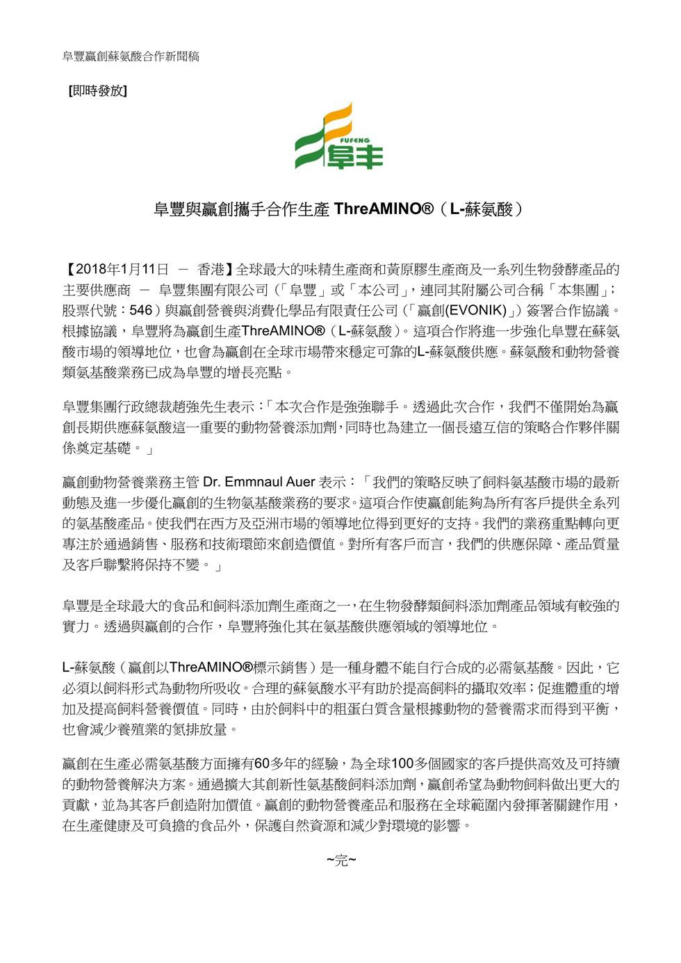 火博体育官方网站·(中国)官方网站与赢创携手合作生产ThreAMINO®(L-苏氨酸)